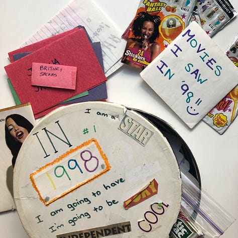 And for those unfamiliar with Capsule 98 or its lore, here’s the cheat sheet: In 2017, I discovered a hilariously earnest, meticulously detailed and weirdly prescient three-box time capsule that I’d created in 1998, the year I turned 13. I lost my damn mind, and Capsule 98 was born. I started posting her contents on Instagram—from ticket stubs from every movie I saw (Titanic x3, obvi), to an itemized list of my school crushes, to a report on the top five trends that year—and it went viral (my fav of all the press was this segment on Good Morning America where they asked Kate Hudson to weigh in on the capsule and she dunked on my 13-year-old musical taste. It starts at 2:45!).